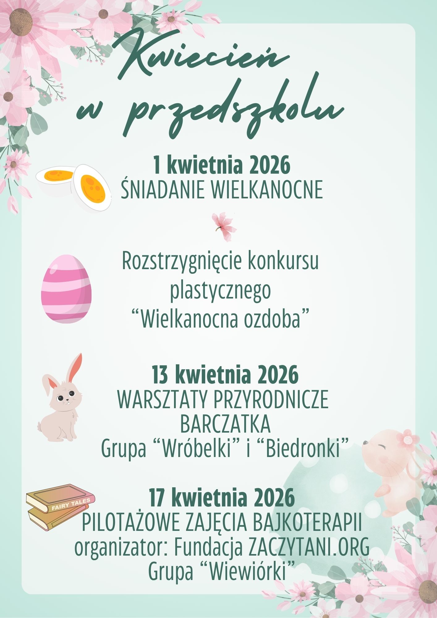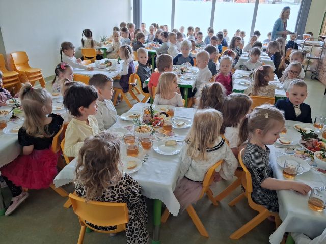 1 kwietnia w naszym przedszkolu odbyło się uroczyste śniadanie wielkanocne. Od rana w salach panowała radosna, świąteczna atmosfera. Dzieci zasiadły do pięknie udekorowanych stołów, na których nie zabrakło tradycyjnych potraw i kolorowych pisanek.