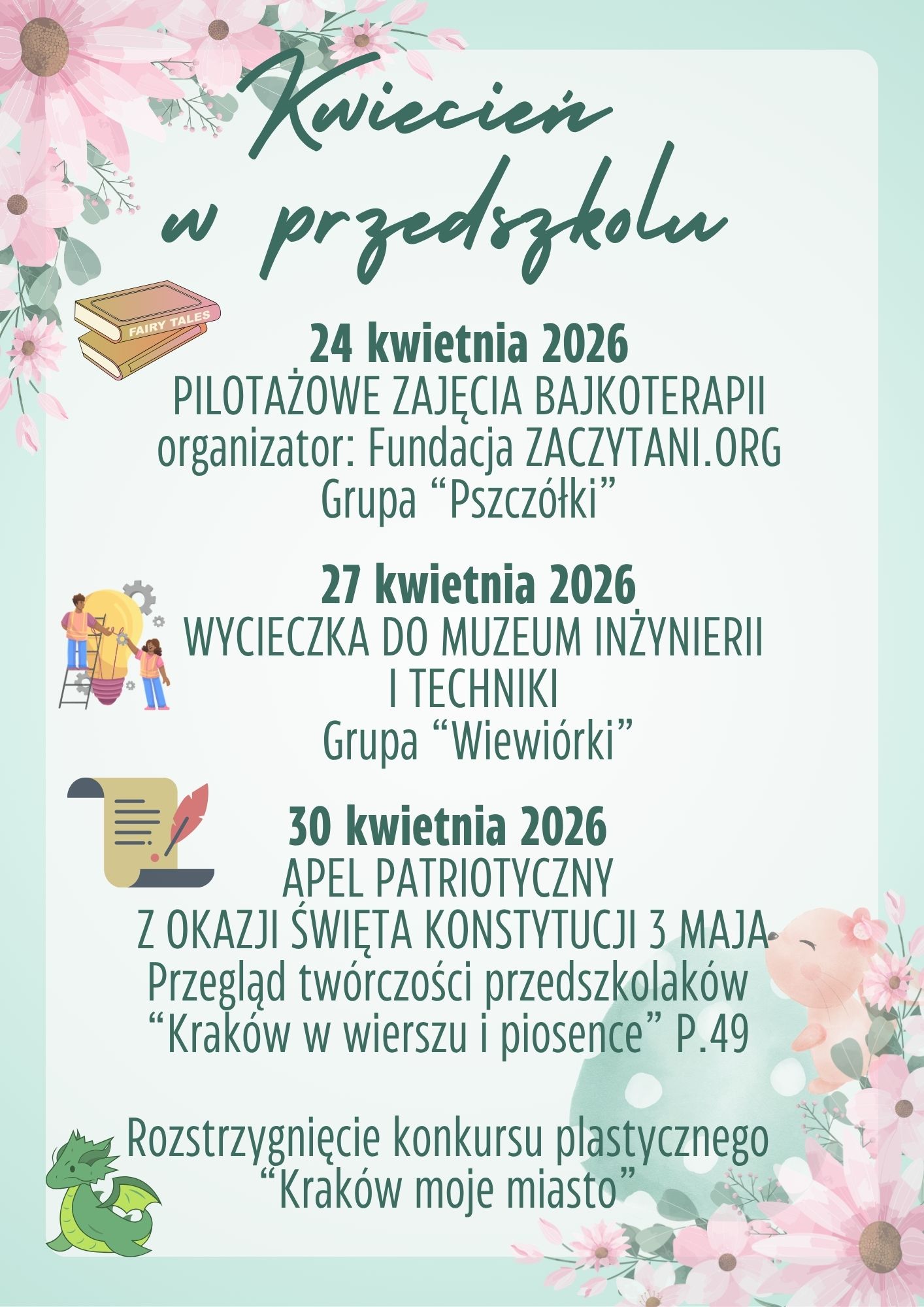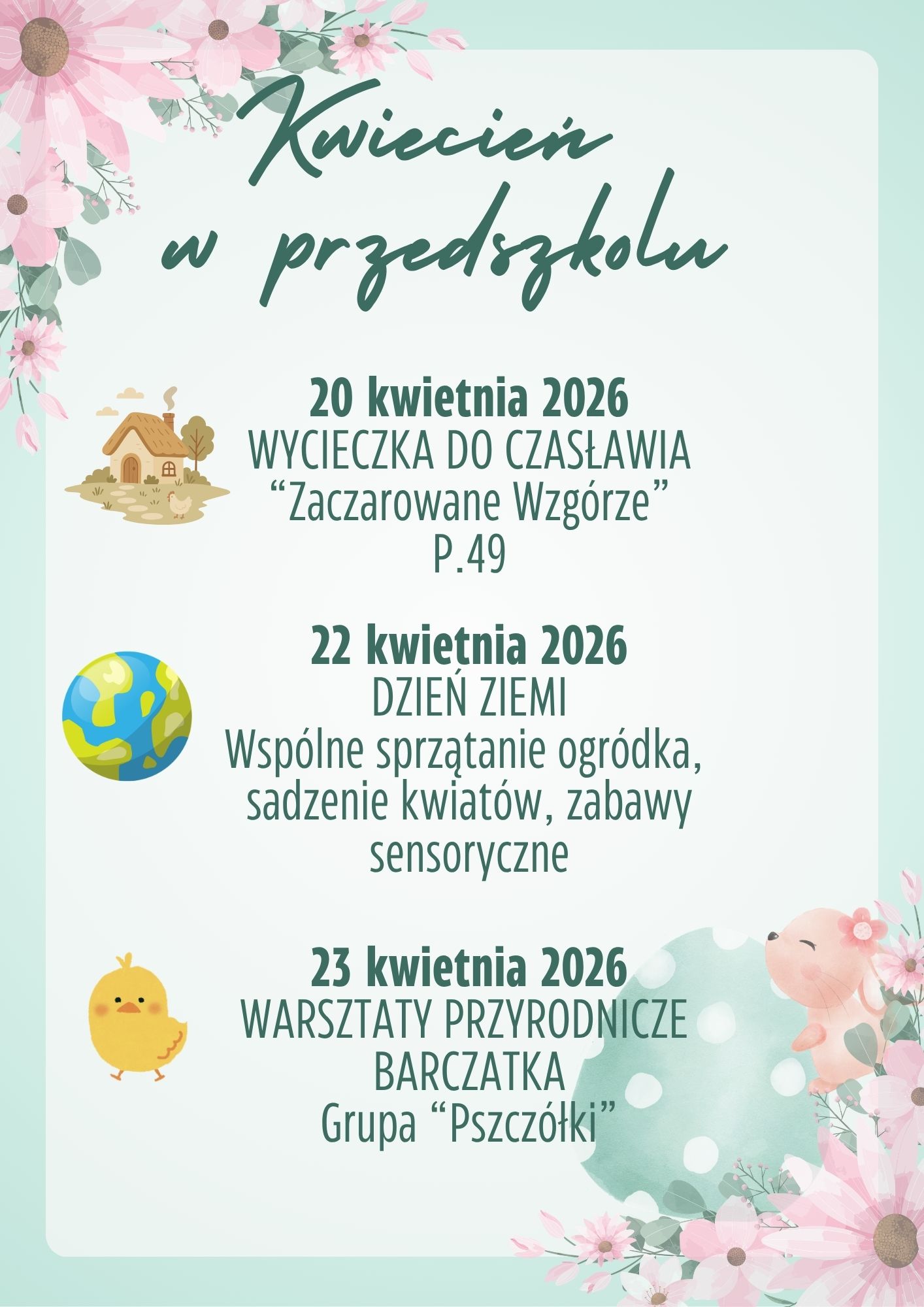 20 marca w naszym przedszkolu odbyło się radosne Powitanie Wiosny. W tym dniu dzieci ze wszystkich grup, zgodnie z tradycją, przyszły ubrane na zielono, symbolizując w ten sposób budzącą się do życia przyrodę.