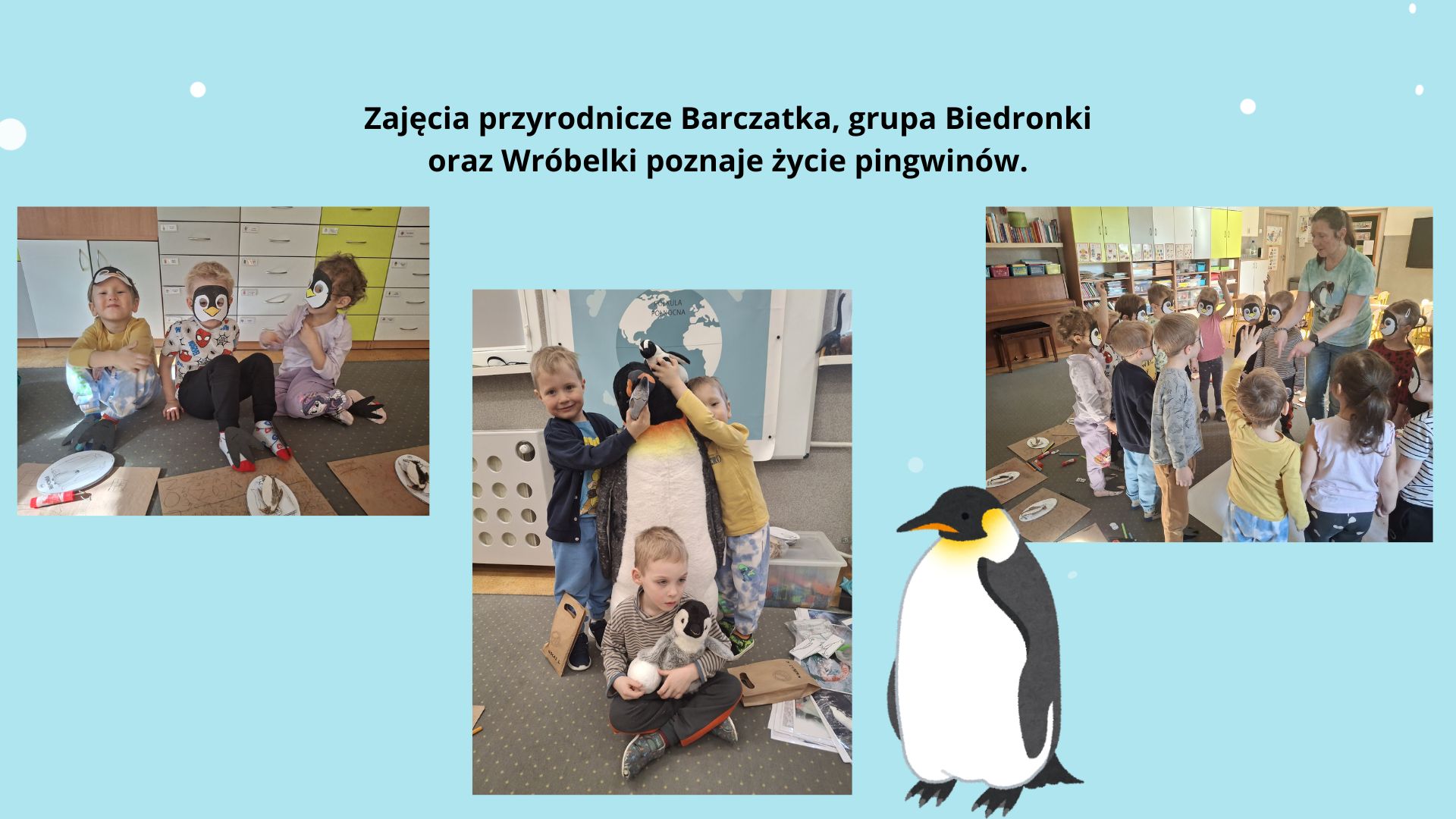 Podczas zajęć „Niezwykła kraina Pana Pingwina” poznaliśmy fascynujący świat pingwinów. Dowiedzieliśmy się, że chociaż wiele osób kojarzy je głównie z Antarktydą, nie wszystkie gatunki żyją wyłącznie tam.